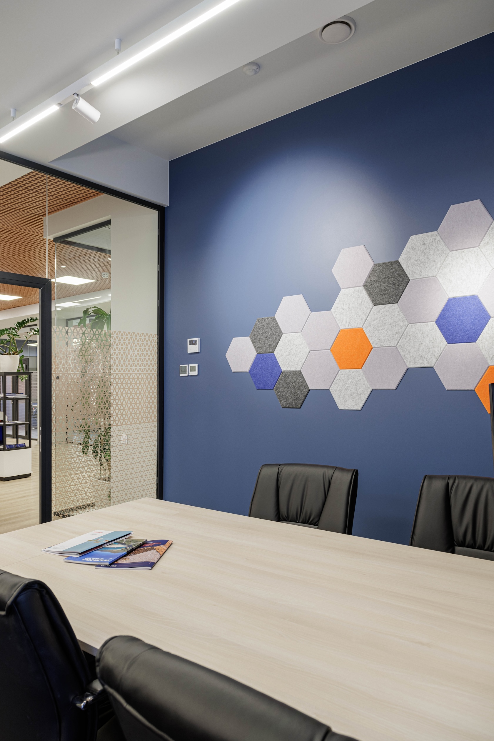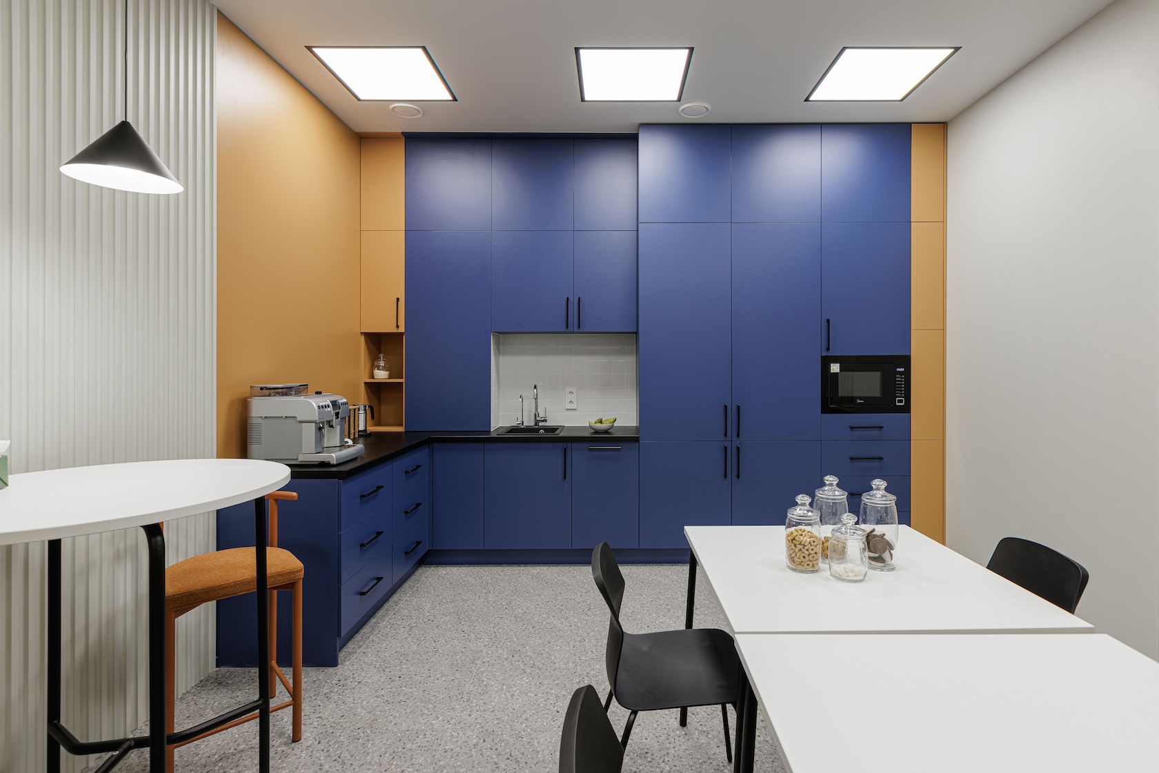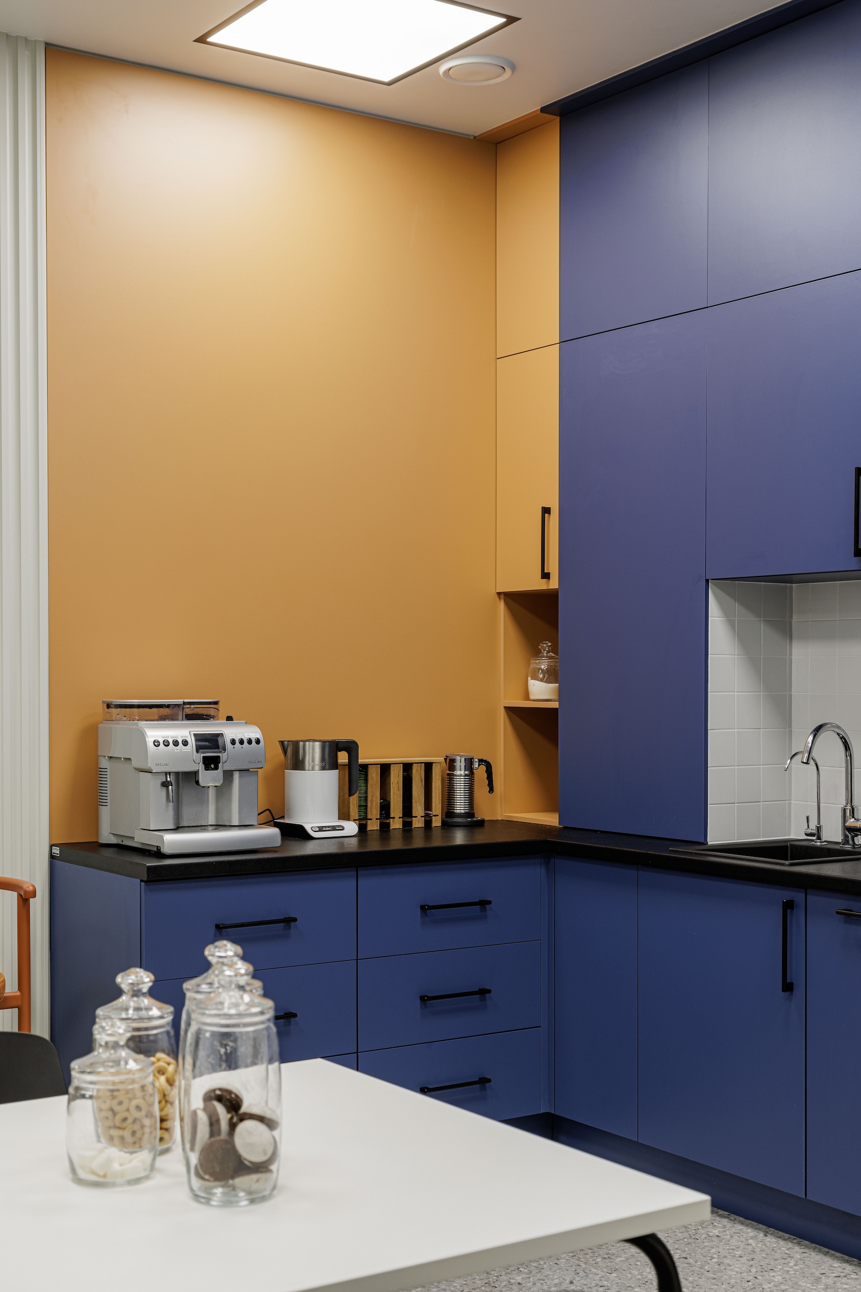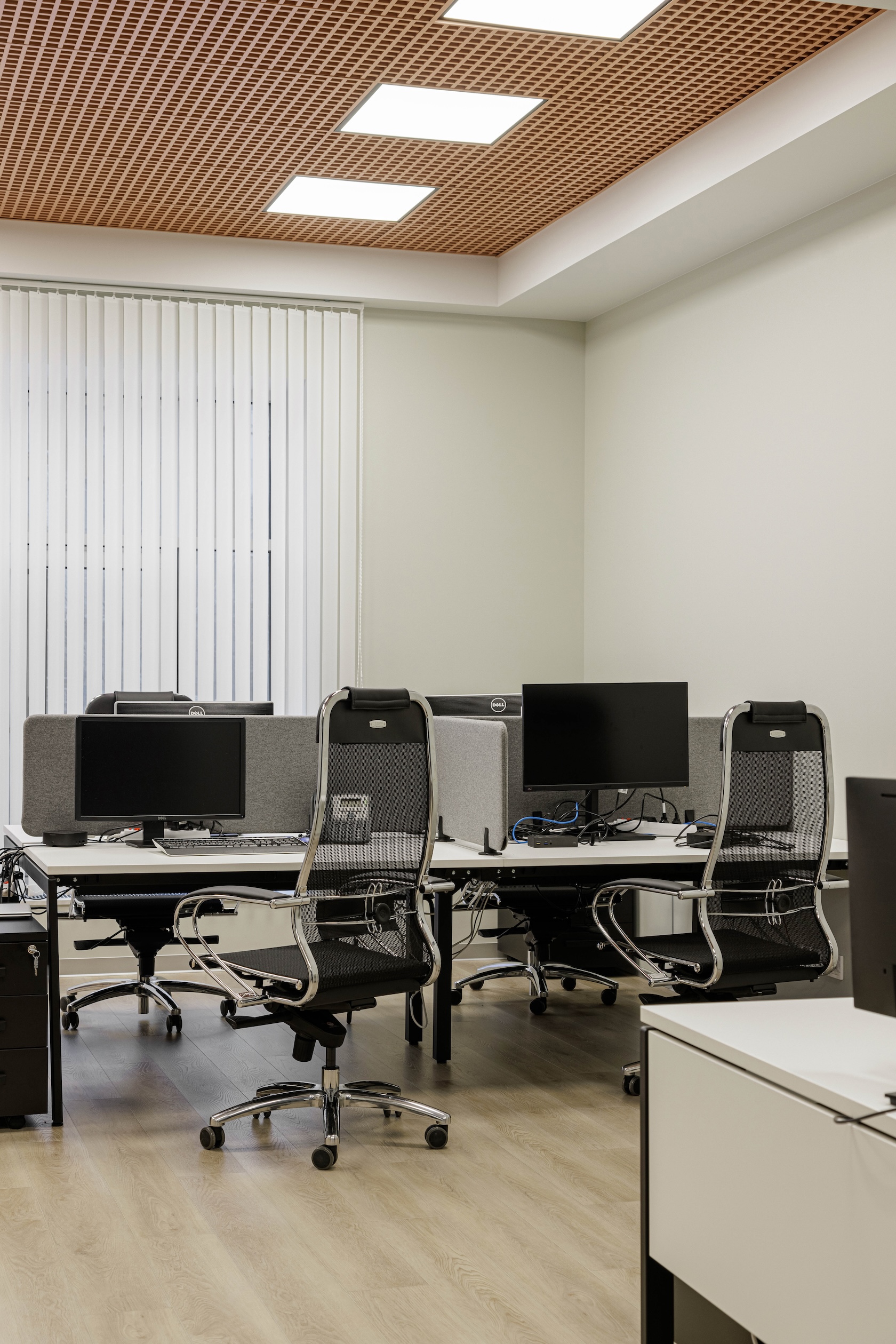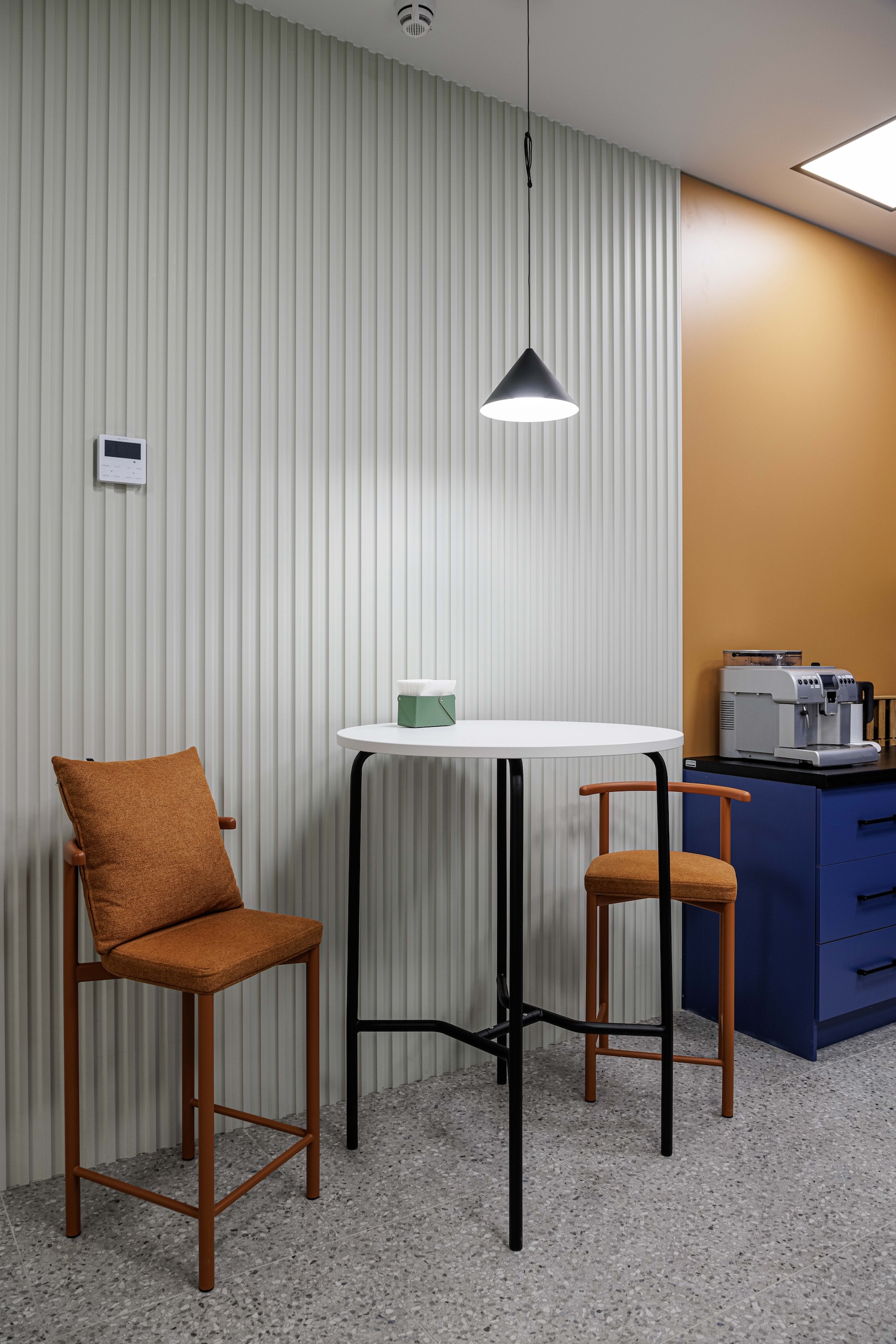 Кабинеты были выкрашены в спокойные светлые цвета. Ресепшн покрашен в акцентный синий цвет вместе с стенами коридора и дверями скрытого монтажа. Буквы красили ручным способом по трафарету, чтобы добиться качественного цвета. Потолок грильятто окрашен в акцентный оранжевый цвет. В общем использовалось 3 основных цвета.