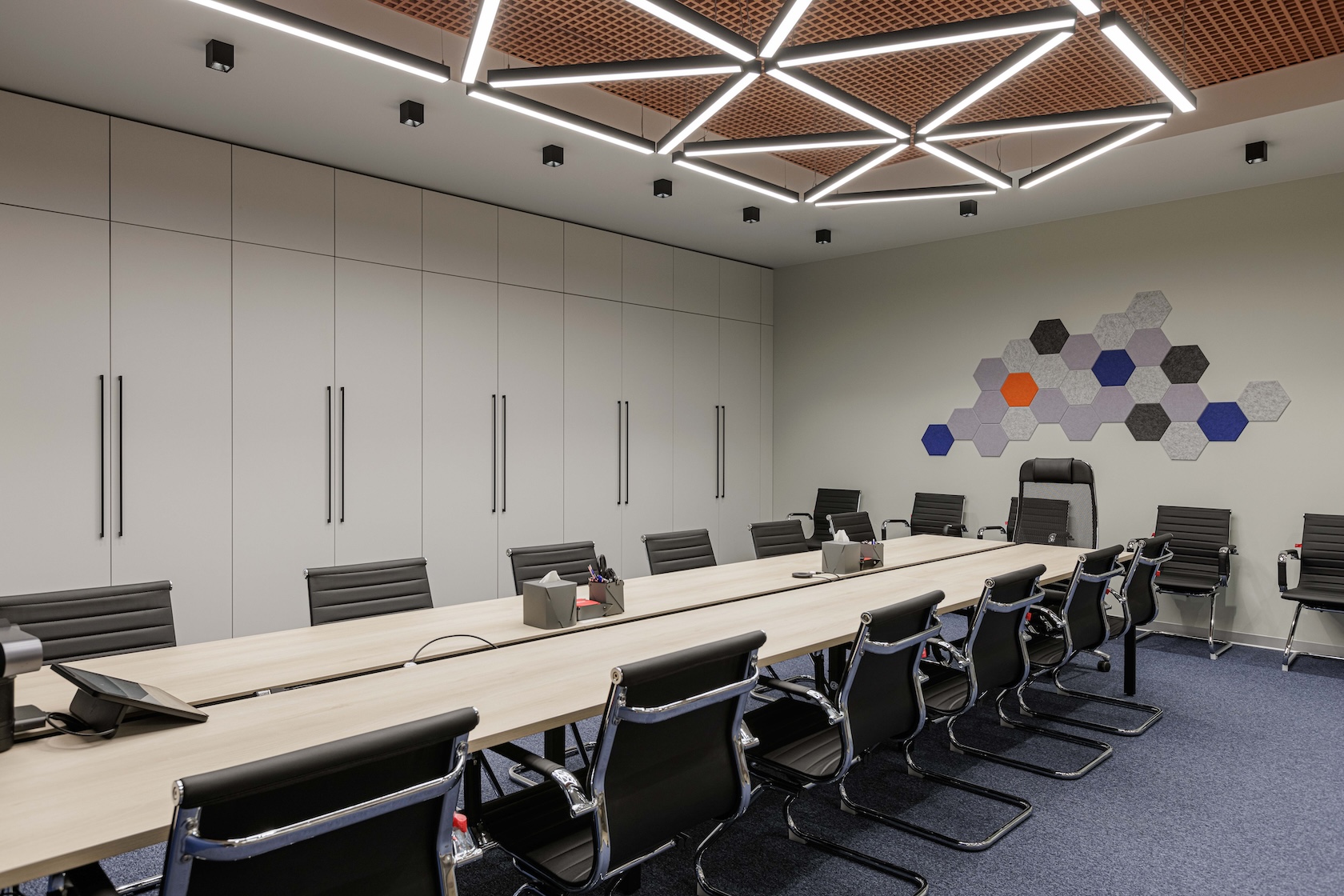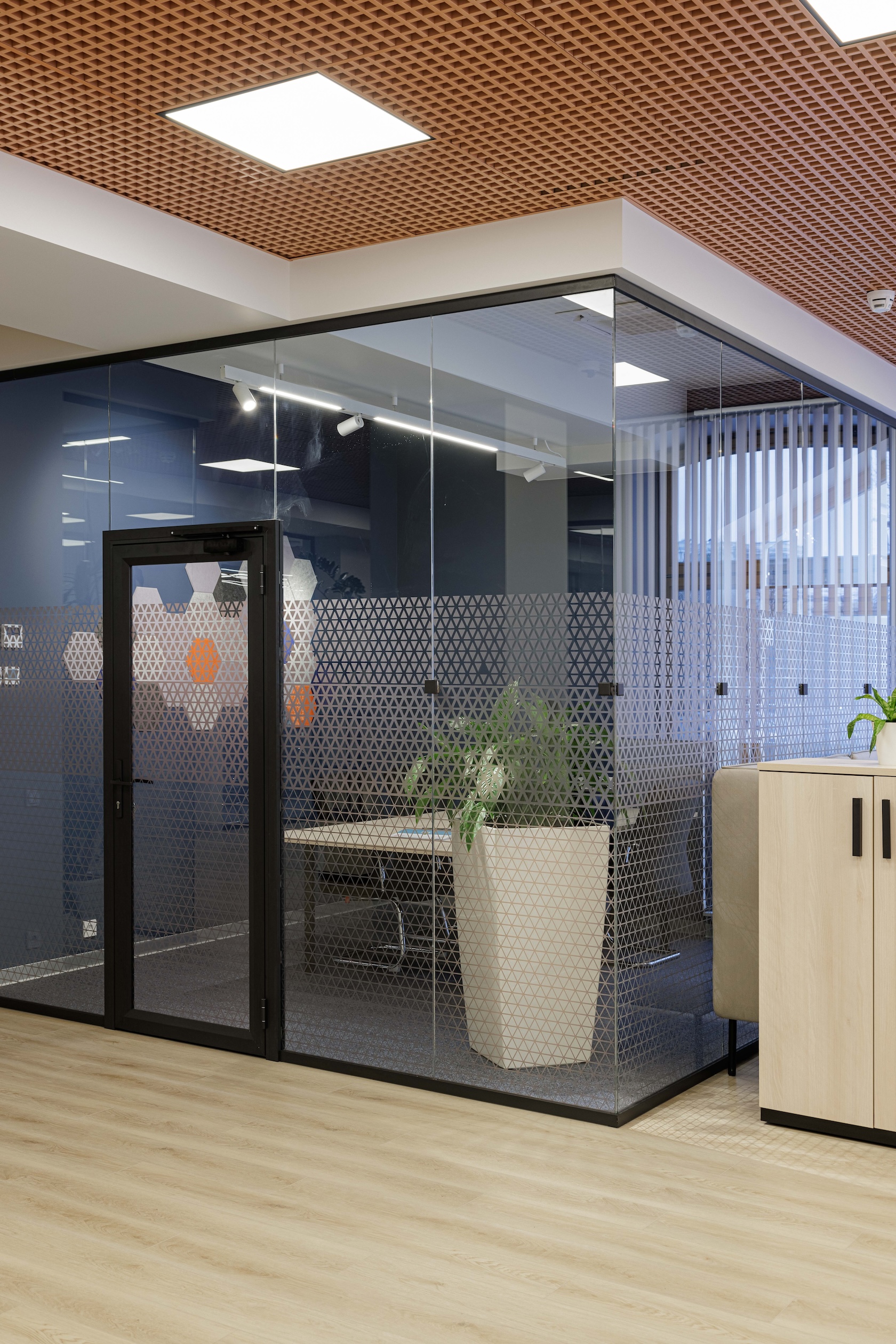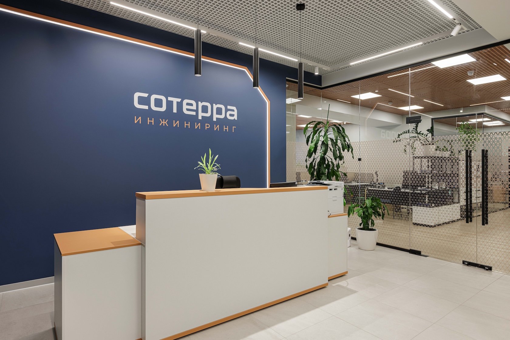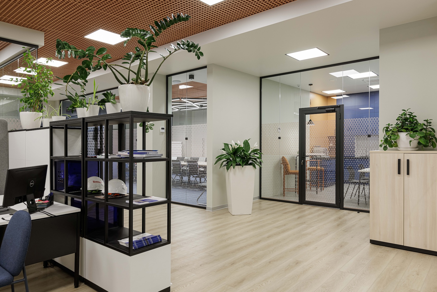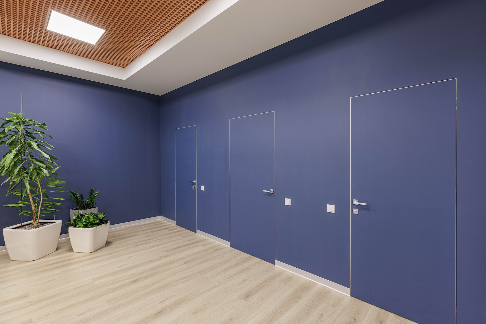 Кабинеты были выкрашены в спокойные светлые цвета. Ресепшн покрашен в акцентный синий цвет вместе с стенами коридора и дверями скрытого монтажа. Буквы красили ручным способом по трафарету, чтобы добиться качественного цвета. Потолок грильятто окрашен в акцентный оранжевый цвет. В общем использовалось 3 основных цвета.