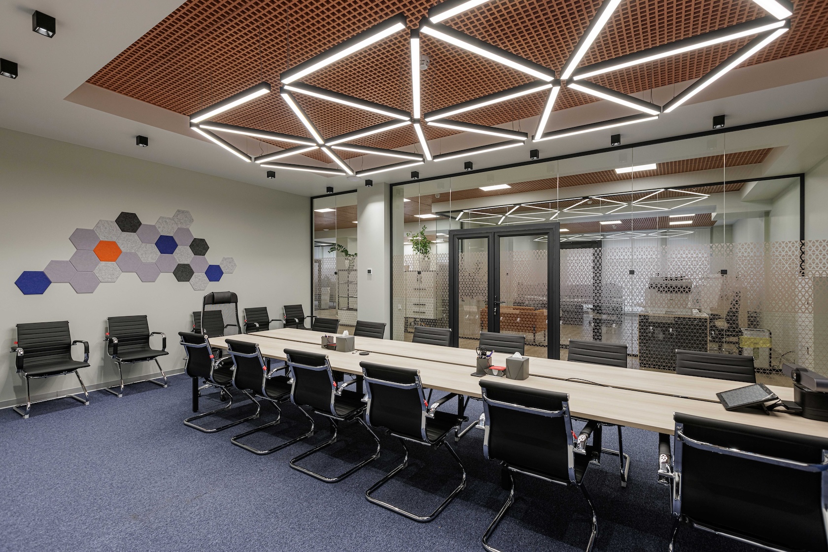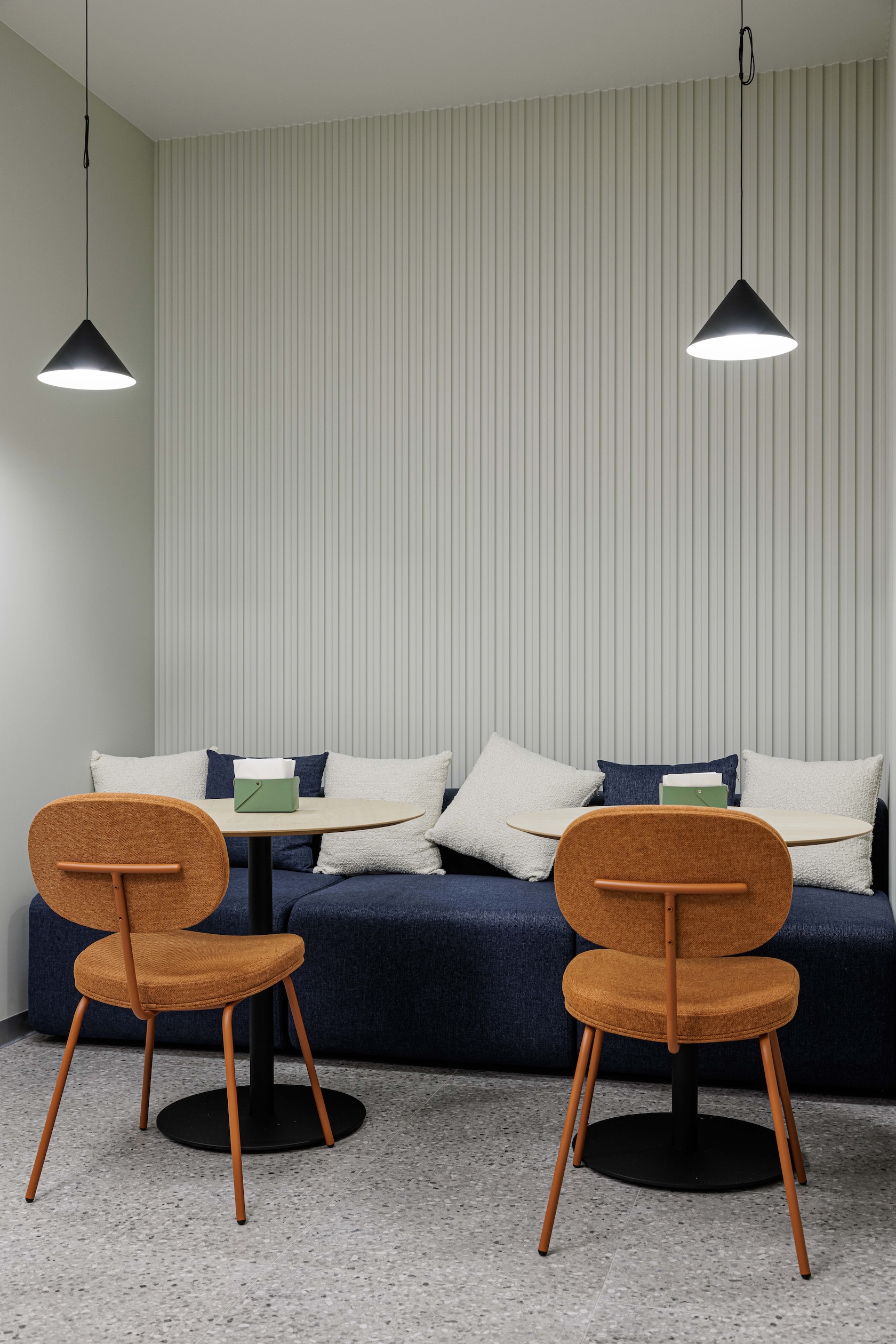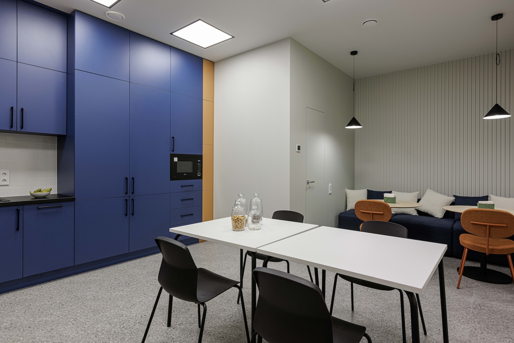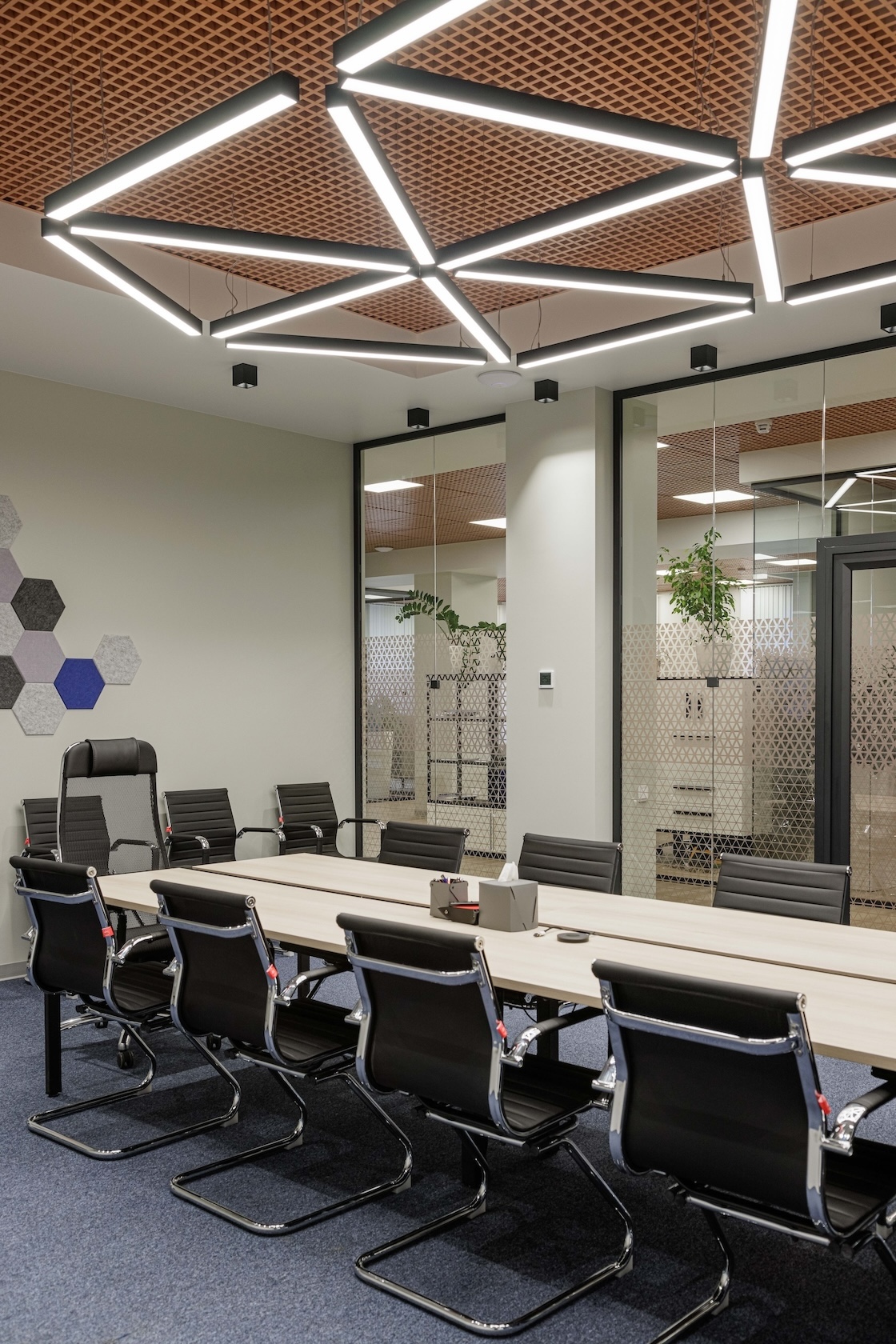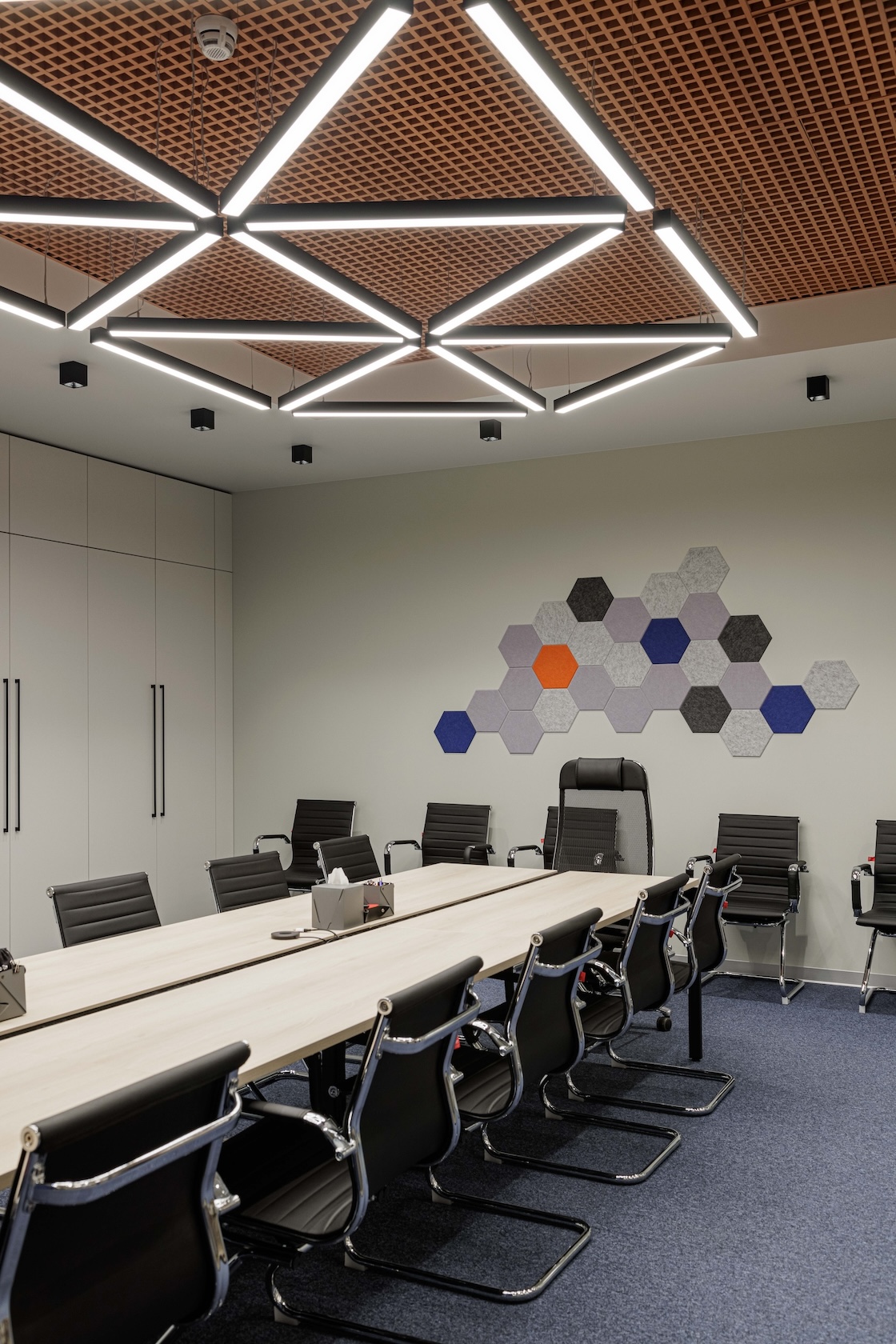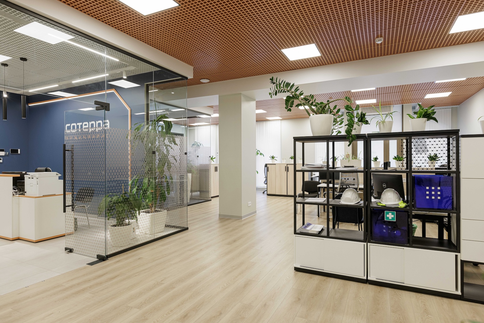 Кабинеты были выкрашены в спокойные светлые цвета. Ресепшн покрашен в акцентный синий цвет вместе с стенами коридора и дверями скрытого монтажа. Буквы красили ручным способом по трафарету, чтобы добиться качественного цвета. Потолок грильятто окрашен в акцентный оранжевый цвет. В общем использовалось 3 основных цвета.