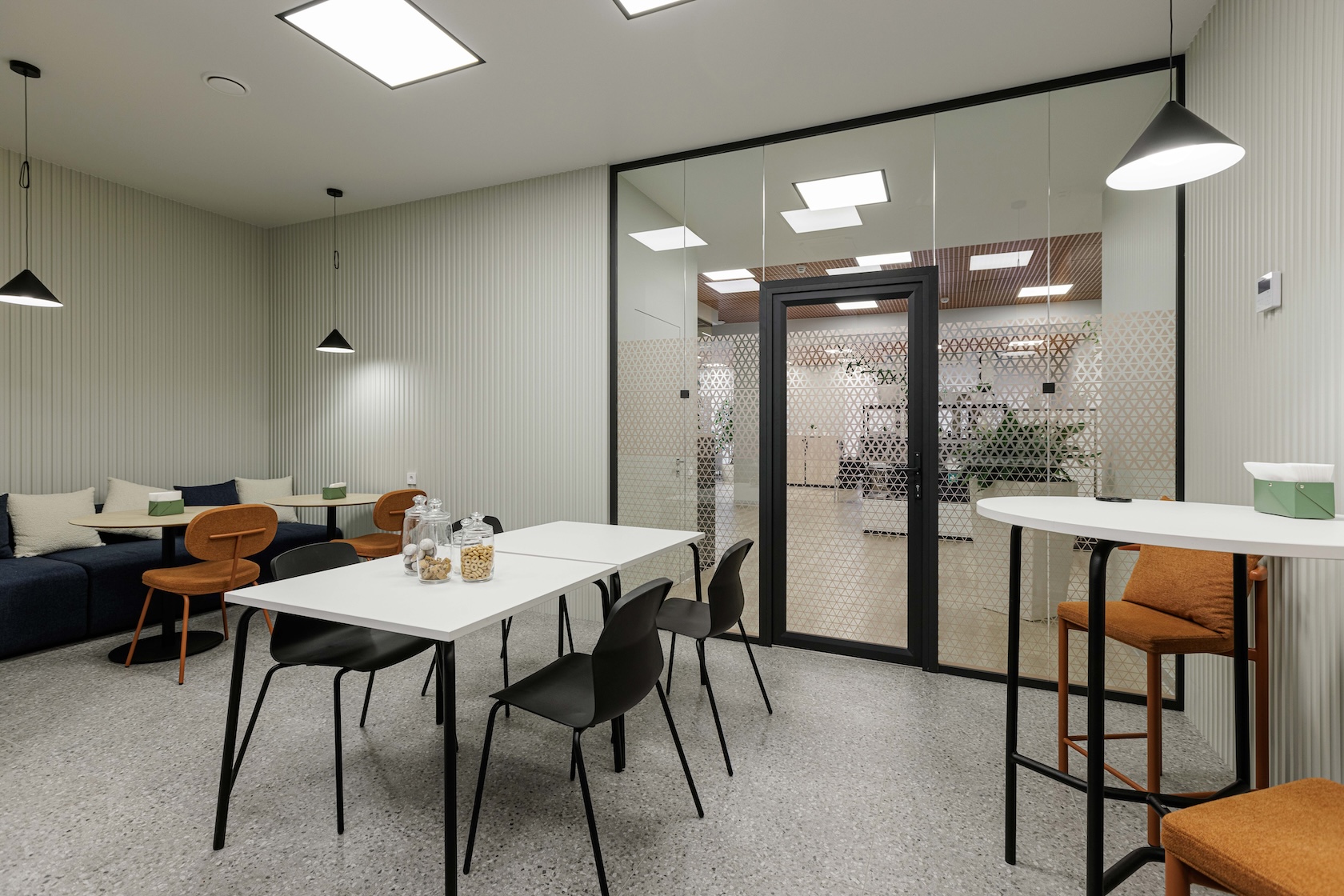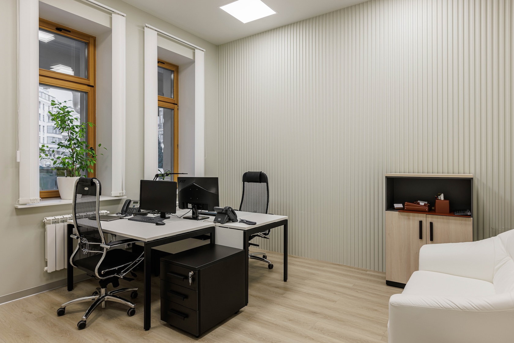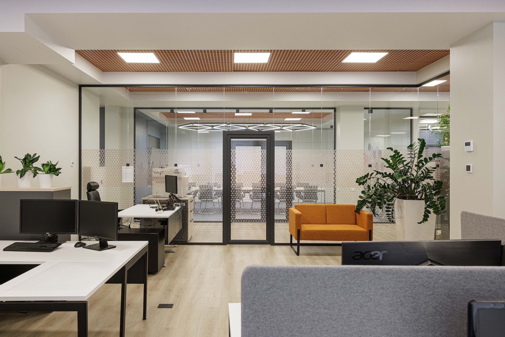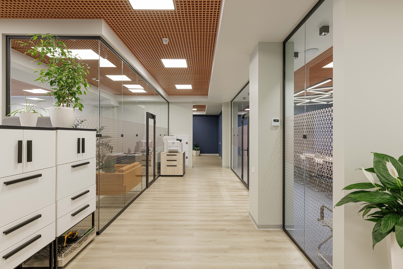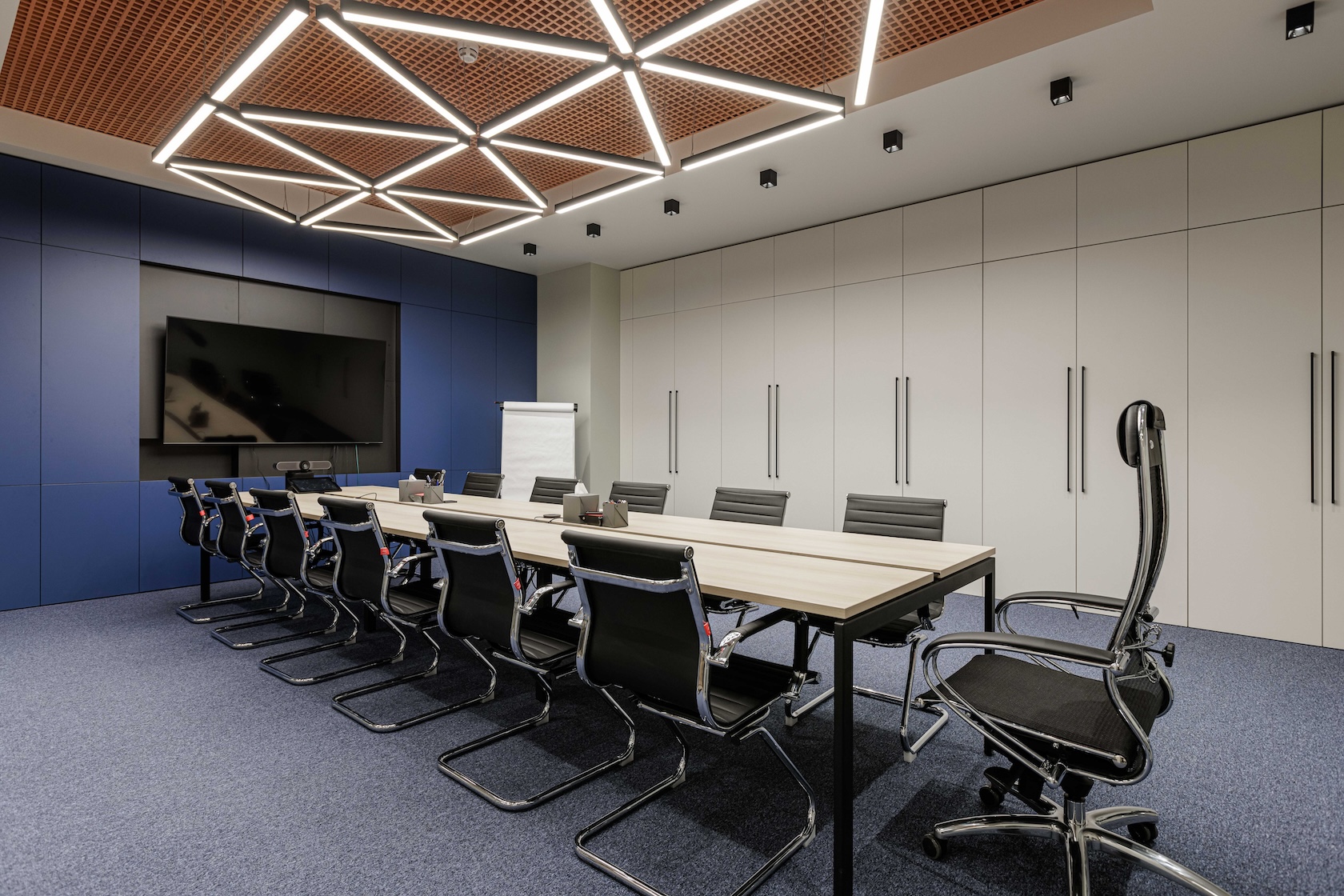 Кабинеты были выкрашены в спокойные светлые цвета. Ресепшн покрашен в акцентный синий цвет вместе с стенами коридора и дверями скрытого монтажа. Буквы красили ручным способом по трафарету, чтобы добиться качественного цвета. Потолок грильятто окрашен в акцентный оранжевый цвет. В общем использовалось 3 основных цвета.