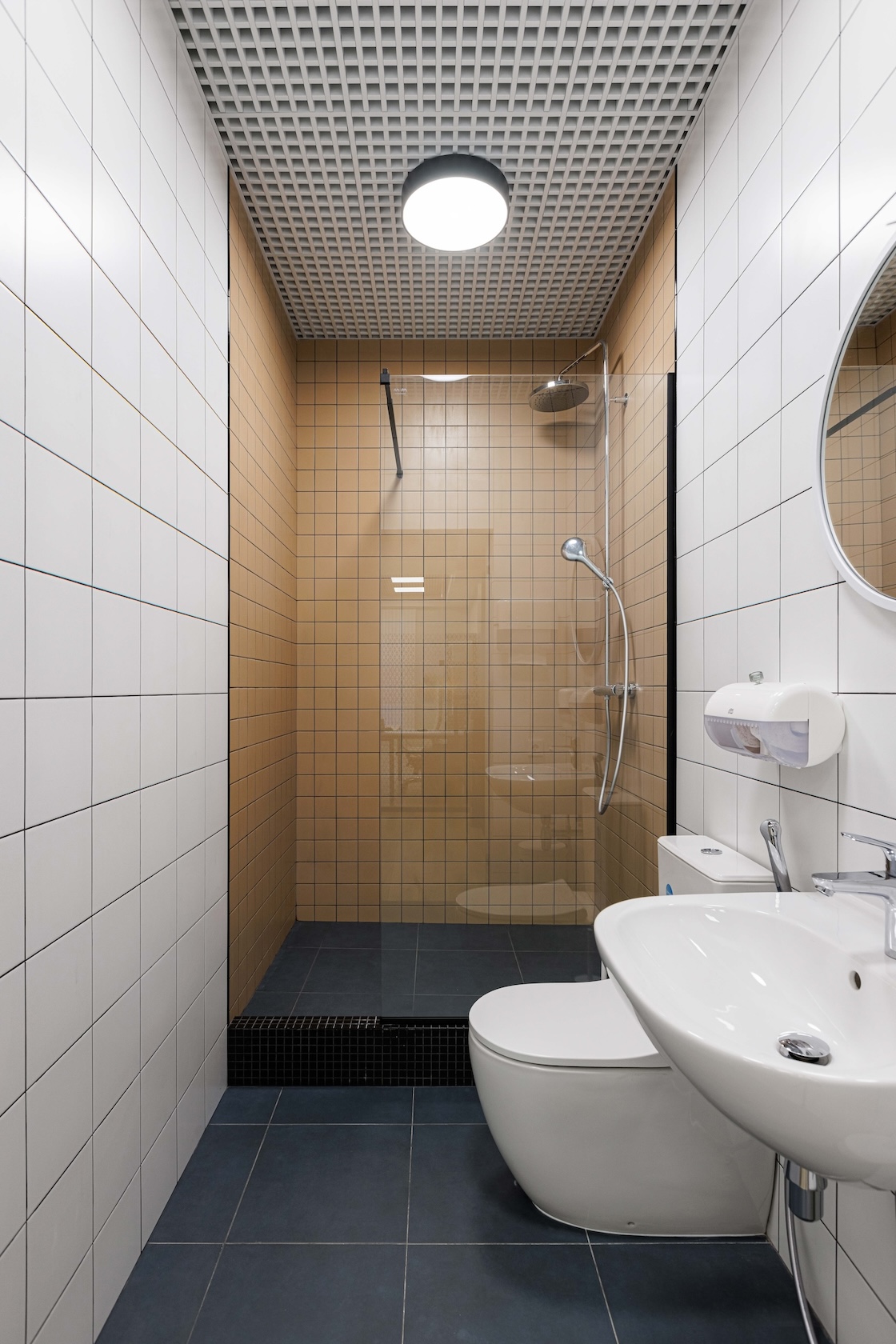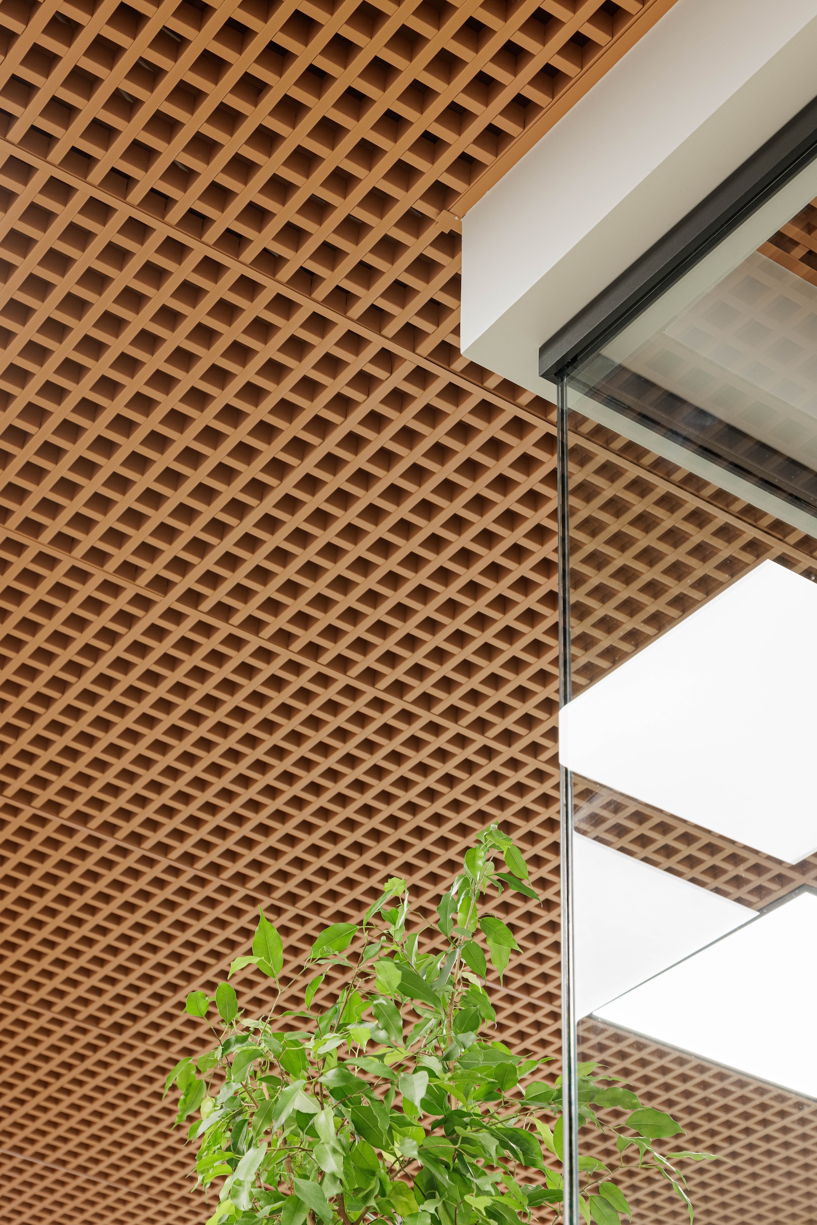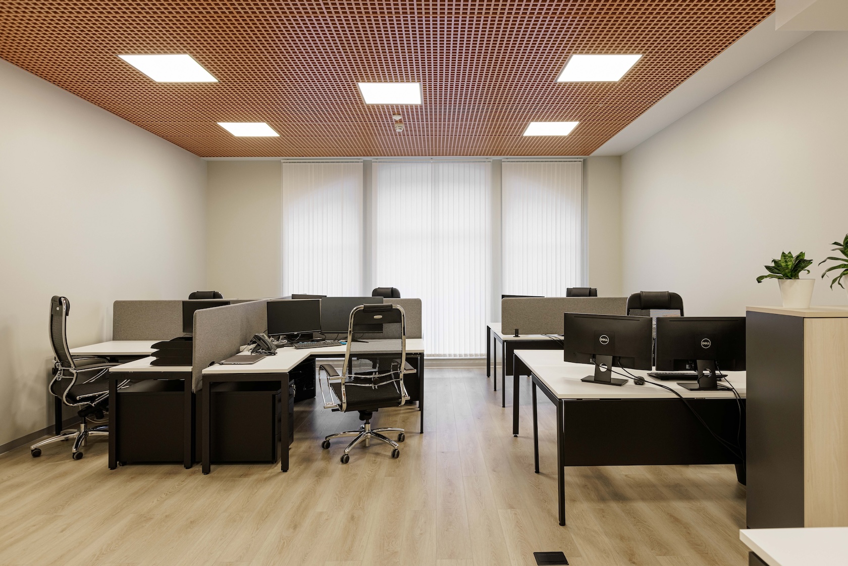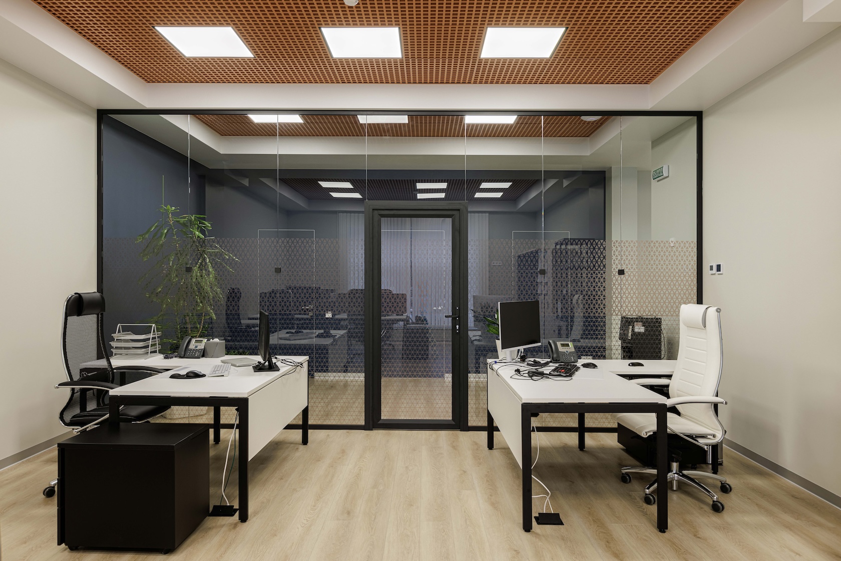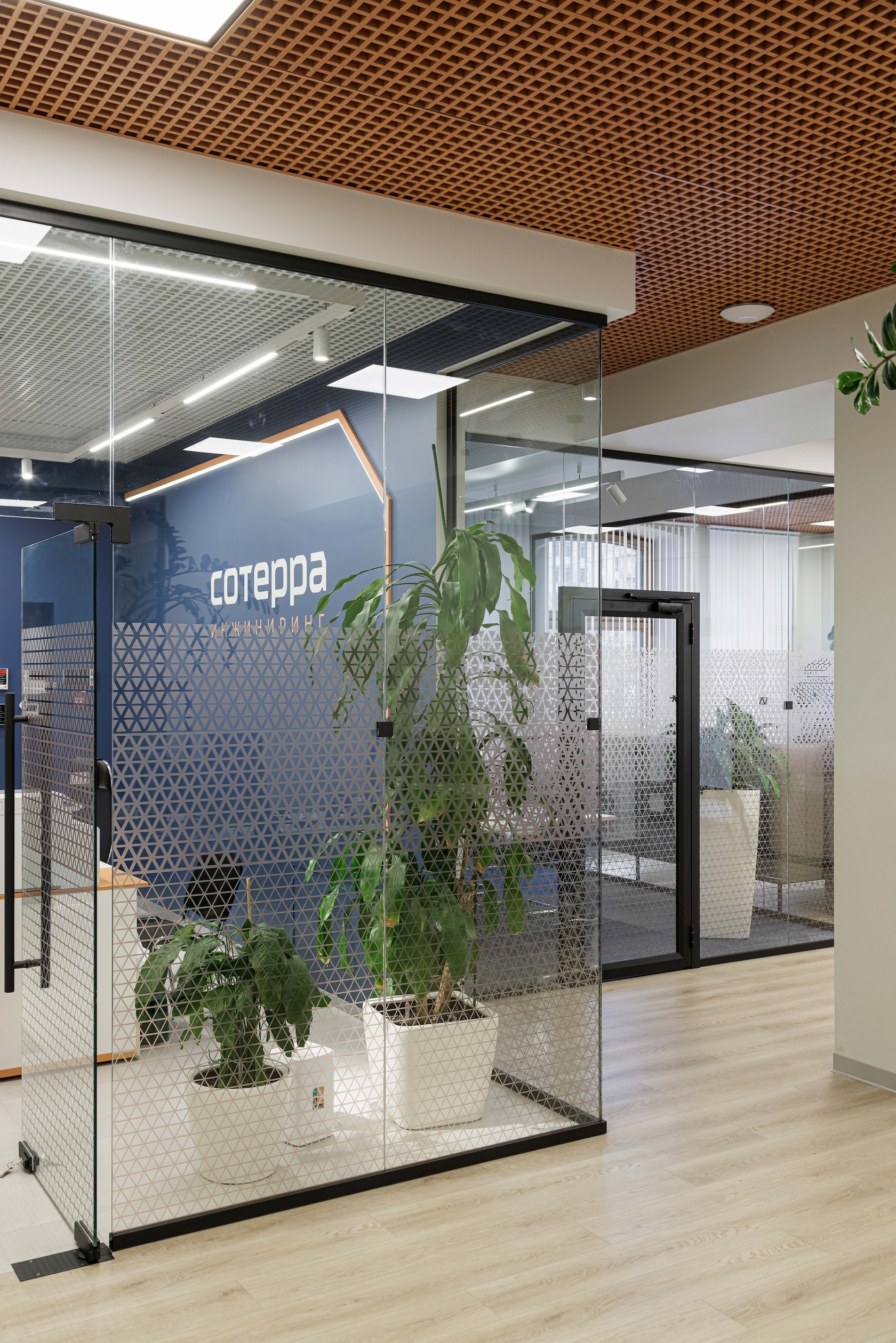 Кабинеты были выкрашены в спокойные светлые цвета. Ресепшн покрашен в акцентный синий цвет вместе с стенами коридора и дверями скрытого монтажа. Буквы красили ручным способом по трафарету, чтобы добиться качественного цвета. Потолок грильятто окрашен в акцентный оранжевый цвет. В общем использовалось 3 основных цвета.